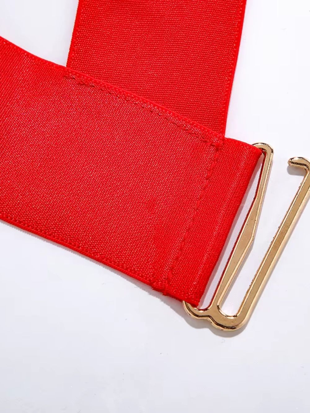 Bondage-Inspired Design: Bold wide straps and open neckline for a daring aesthetic
